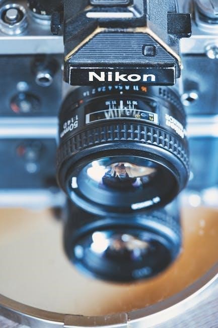 The Nikon F4’s manual explains the viewfinder’s information display, crucial for precise framing and settings. Adjust the diopter for optimal clarity, as detailed in the PDF.